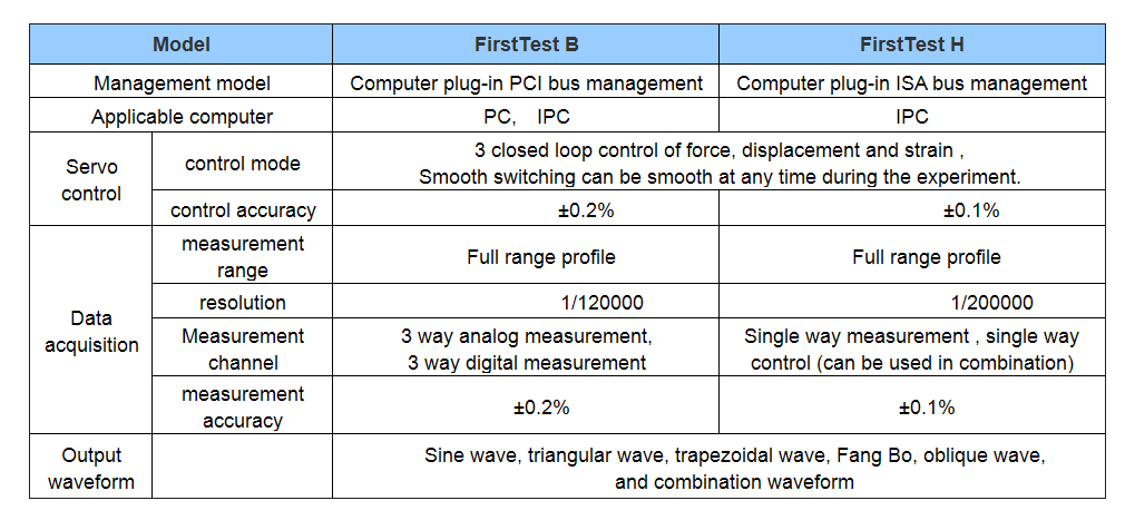 FirstTest controller is a full-digital control system and data acquisition controller developed independently by AOWEI. Standard static tests and low cycle fatigue tests were performed. It can be used as a synchronous controller in the field of automatic control, and it is also widely used in high precision, complex industry and large tonnage loading equipments.